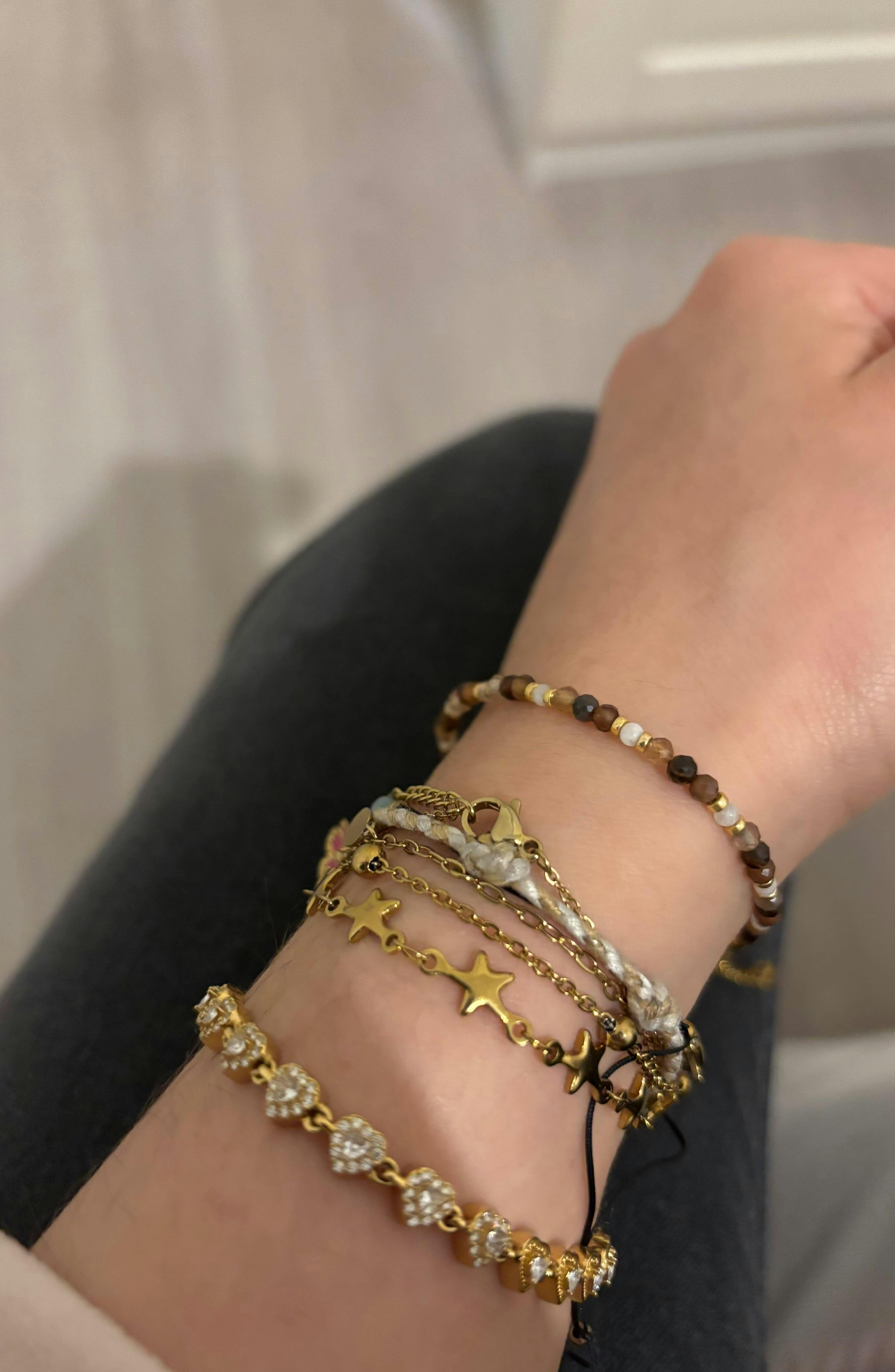 - Matériaux : Acier inoxydable, doré à l’or fin, pierre semi précieuse d’Agate teintée, pierre de lune, perle miyuki.